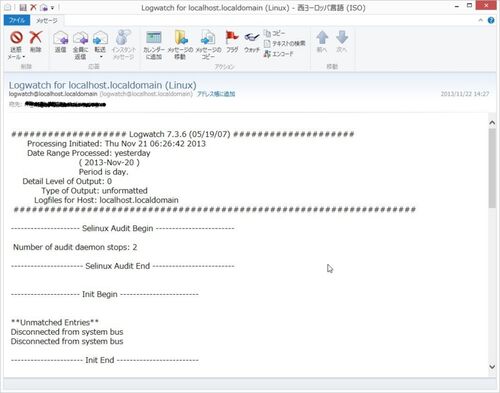 logwatchを入れる 手順 yumでインストール [root@localhost ~]# yum install -y logwatch [root@localhost ~]# 「/usr/sbin/logwatch --print」で確認 ################### Logwatch 7.3.6 (05/19/07) #################### Processing Initiated: Thu Nov 2…